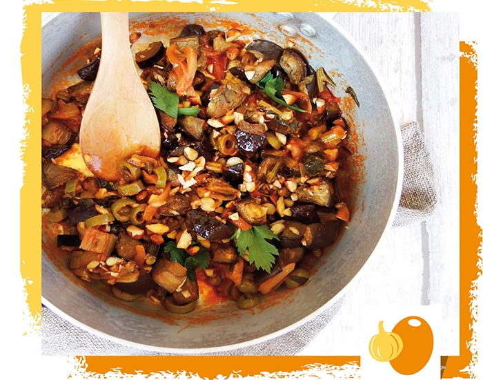WARM CAPONATA WITH OLIVES, CAPERS AND TOASTED ALMONDS