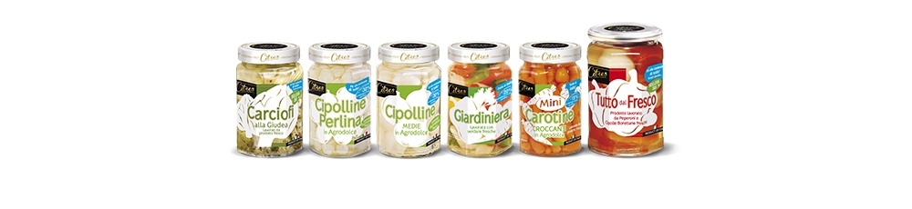 Carciofi alla giudea, Cipolline perlina in agrodolce, Mini Carotine croccanti in agrodolce, Cipolline medie in agrodolce, Giardiniera lavorata con verdure fresche.