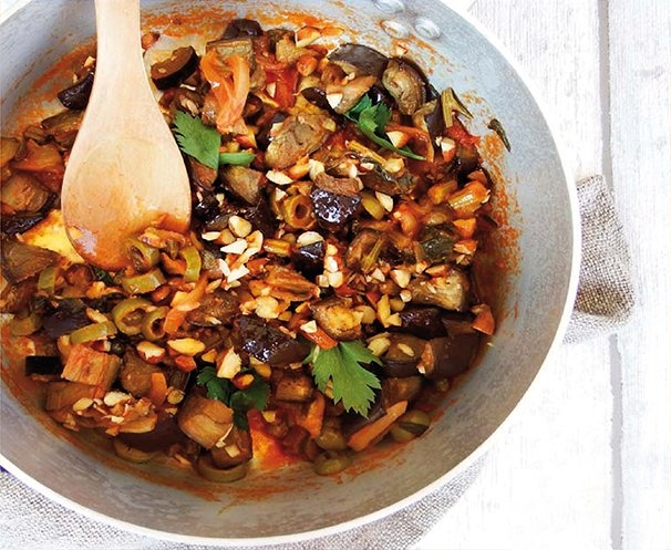 CAPONATA TIEPIDA CON OLIVE, CAPPERI E MANDORLE TOSTATE