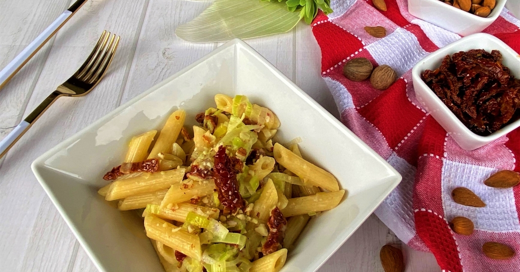 PENNE AI PORRI, POMODORI SECCHI A FILETTI E MANDORLE