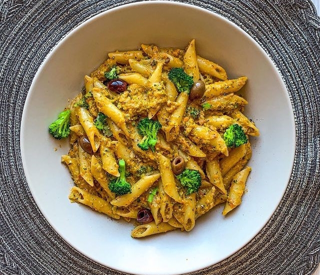 PENNE CON PESTO DI BROCCOLI, POMODORI SECCHI, OLIVE TAGGIASCHE E PISTACCHI