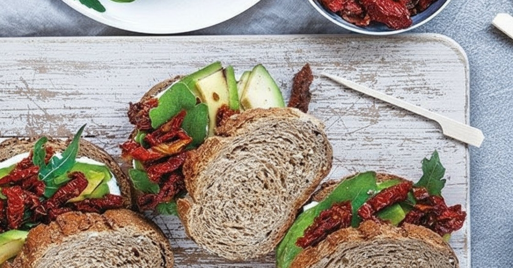 - Disponete sul pane la crema di tofu, le fette di avocado, i pomodorini e la rucola.